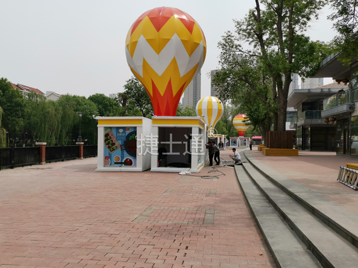 此款售貨亭 也被稱為商亭,商亭是現(xiàn)代建筑的一個(gè)詞匯,顧名思義“商”作為商業(yè)交易來(lái)應(yīng)用,亭作為一種建筑詞匯;售貨亭外型氣球造型新穎,吸引游客,從而對(duì)美食產(chǎn)生不可控之情;