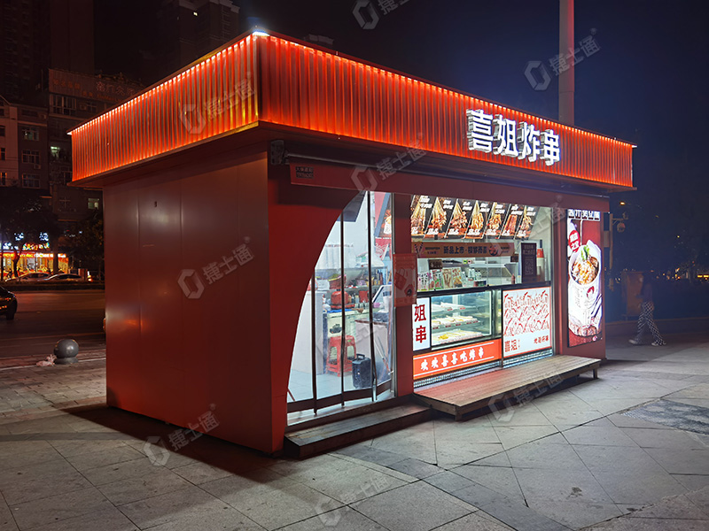 捷士通生產(chǎn)的炸串商亭售賣亭是一個尺寸為3乘6米的商業(yè)設施,專門用于銷售炸串等美食