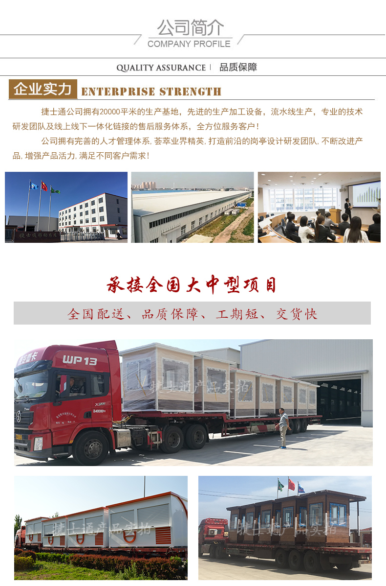 天津市捷士通科技有限公司坐落于美麗的天津市北辰區(qū)萬發(fā)科技園。占地面積20000平方米,是一家經(jīng)驗(yàn)豐富設(shè)計(jì)、研發(fā)、生產(chǎn)、銷售環(huán)保移動(dòng)房屋結(jié)合智能化一體的經(jīng)驗(yàn)豐富生產(chǎn)供應(yīng)商。聯(lián)系電話:15822882616。
