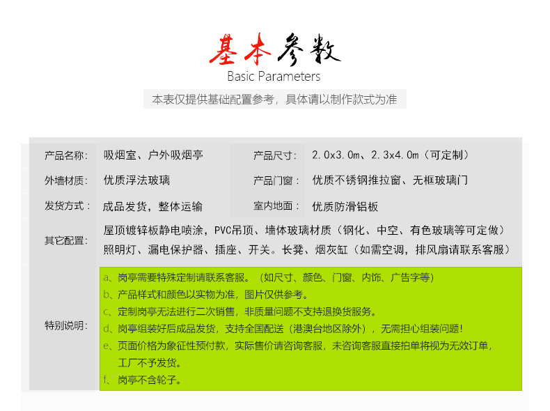 標(biāo)準(zhǔn)配置:屋頂鍍鋅板靜電噴涂,PVC吊頂,墻體玻璃材質(zhì)(鋼化、中空、有色玻璃等可定做),照明燈,漏電保護(hù)器,插座組,開關(guān),長凳,煙灰缸(如需空調(diào),排風(fēng)扇請聯(lián)系客服。咨詢電話:15822882616,公司網(wǎng)址:m.wpjkoc.com