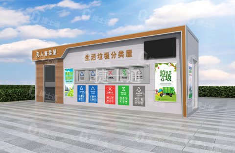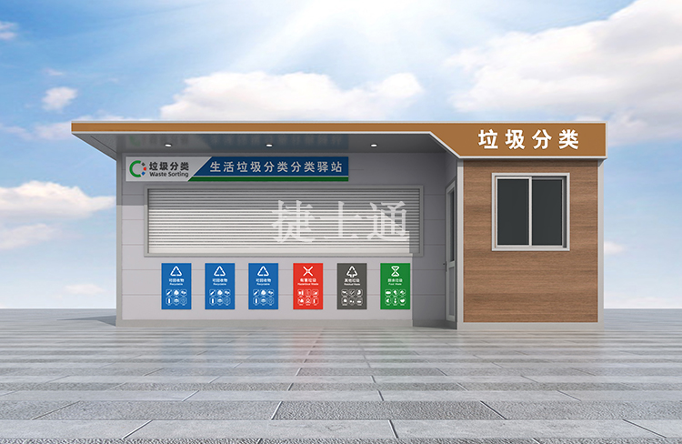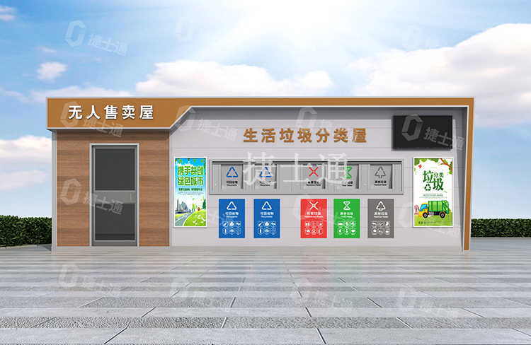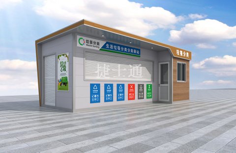 此款為房屋型垃圾分類房,是以房屋為承載體,內(nèi)部配以垃圾箱或者智能垃圾回收箱,形成步入式垃圾投放的形式,其產(chǎn)品優(yōu)勢為外觀靚麗,可融入周邊建筑群體,并可以為垃圾分類引導(dǎo)員提供休息執(zhí)勤的空間,房屋內(nèi)部設(shè)備配套齊全,可有效解決氣味污染、環(huán)境視覺污染等問題;但是造價相對較高,基本以長期固定的形式呈現(xiàn),為未來發(fā)展趨勢