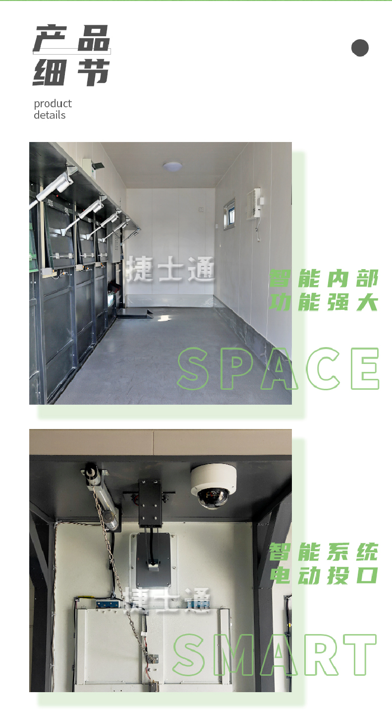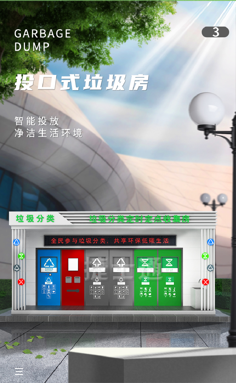 捷士通研發(fā)的智能分類垃圾房,室內(nèi)包含有,煙感器、噴淋系統(tǒng)、智能投口(窗口式、推臂式、直流式、機(jī)械式),高壓水槍,滅蒼蠅設(shè)備,紫外線消毒,除臭設(shè)備等一應(yīng)俱全。