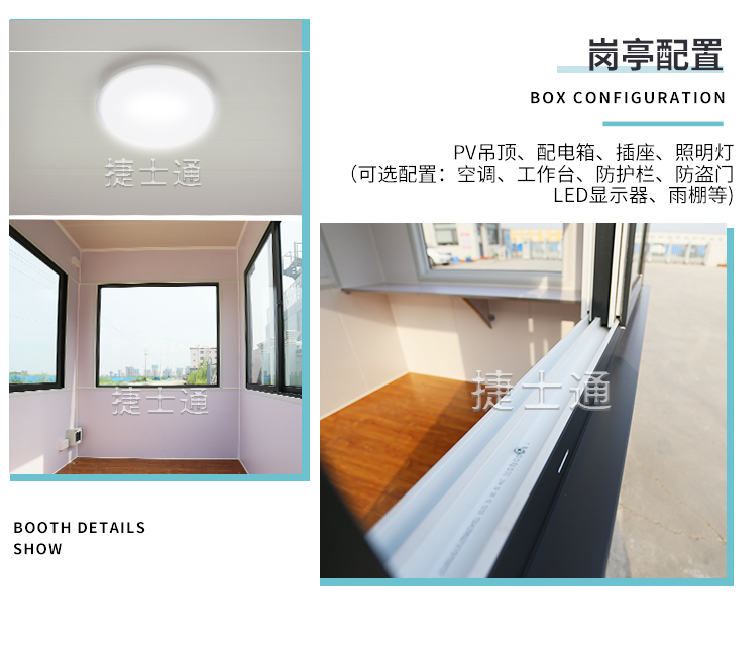 合理的外觀設(shè)計(jì)使得視野相當(dāng)開闊,搭配靈活,亭內(nèi)各種配置如照明燈、電源插座、電控箱和電腦桌、換氣扇等等一應(yīng)俱全,滿足各類功能所需,并可配置收費(fèi)系統(tǒng),以滿足各種需求。