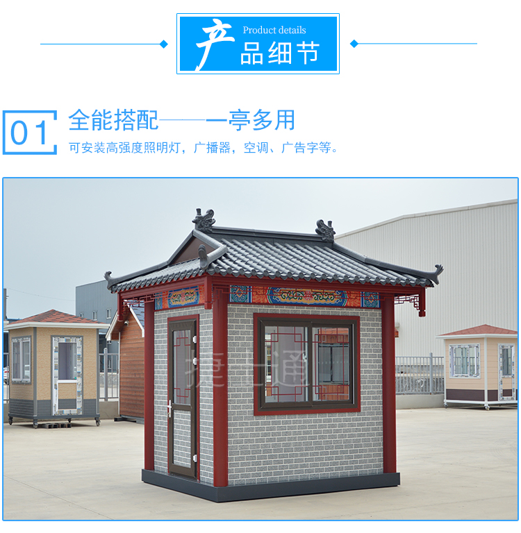 特有的造型,仿古的花紋,創(chuàng)意的窗飾,與古建筑恰到好處的融合,仿古的景區(qū)、仿古的公園、仿古的景點,保安崗亭、售票亭、休息亭均可采用此類風格,而且在設計的時候,尺寸均可定制?。。?!運輸怎么解決?捷士通廠家和全國的物流均有合作,所以只要您在中國,均可運輸?shù)剑。?br />